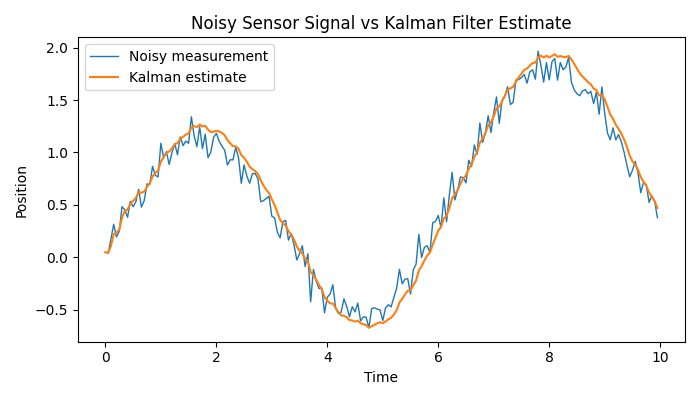 We'll start from this plot, representing noisy measurements of a signal, filtered with a Kalman filter: